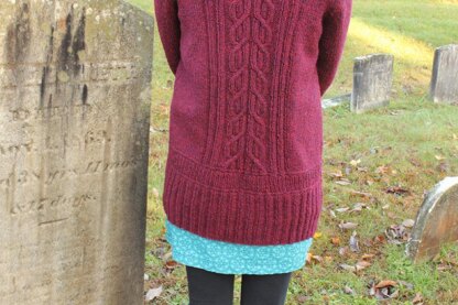 Bloody Mary began with the idea of a deep red, kinda long, cozy, tweedy sweater. I wanted to play with the 1960s silhouette of a low belted dress and combine it with cables to create a flattering structural element. The combination proved to be simple but bold, and very flattering.