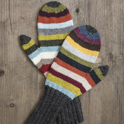 Blue Sky Fibers' 21 Color Mitts Kit comes with the printed pattern and all the yarn needed for these striped mittens.