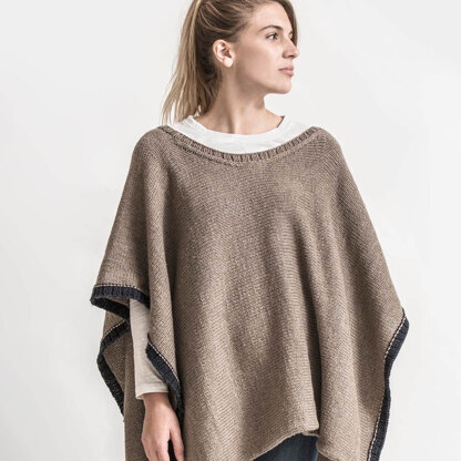 The Big Splash Poncho from Blue Sky Fibers is the adult version of the Puddle Jumper Poncho. The worsted weight garment is knit flat from side to side with no seaming, and the neckband is picked up and worked in the round. Contrasting ribbing along the edges adds interest. With 30 colors of Sweater to choose from, the hardest part of knitting this poncho will be choosing your palette!