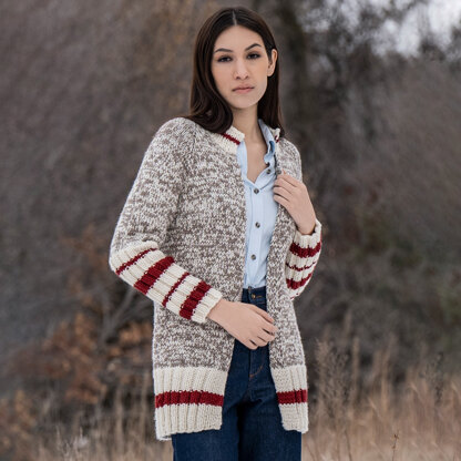 The Blue Sky Fibers Hood River Cardigan is a long, cozy layer that will have you ready for winter weather in style! This open-front cardigan has classic raglan shaping and sporty stripe accents on the body, sleeves, and collar. Two strands of Woolstok are held together throughout this project, creating an incredibly warm and soft fabric and its great palette of heathered shades provides lots of customization options. Hood River Cardigan is knit from the bottom up to the underarms in one piece with the sleeves knit in the round and joined to the body to work the yoke in one piece. Grafting the underarms closed and adding the collar are the only finishing work on this sweater, making it quick from bind-off to go-to layer! Mix and match your favorite shades of Woolstok to create a unique sweater that will always be ready to ward off the winter chill with the Hood River Cardigan!