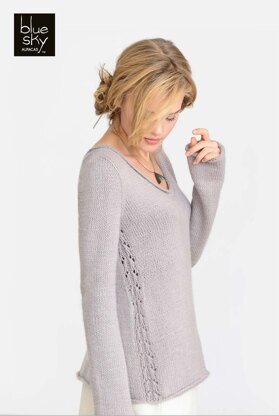 The Blue Sky Fibers Norwood Pullover is knit in the round for a smooth silhouette. This wear-it-anywhere v-neck has a chic, surprising twist: an intricate lace inset at the sides. Slip it over a cami and jeans or dress things up with a slim skirt and statement necklace. It's bound to be a classic in soft and cozy Blue Sky Fibers Suri Merino. The body of Norwood is knit in the round from the bottom up to the underarms, with the front and back completed separately and grafted at the shoulders. Sleeves are knit in the round to the knit-flat cap and set into the armholes during finishing. Lace pattern is written only.