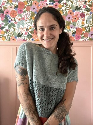 resembles blueberries. The boxy body and positive ease gives it a modern, easy-to-wear fit. Knit up in White Dog Farm VT fingering-weight farm yarn, it makes the perfect layering piece for your handmade summer wardrobe!