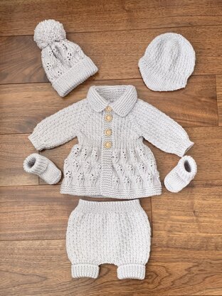 Inspired by the very popular 'Bluebell Romper' this 5 piece set matches it perfectly. Unlike the Bluebell romper, this 5 piece set is knitted from the top down on straight needles. A very practical and modern design that is very quick to knit up with minimal sewing.