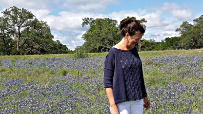The front and back of the sweater are worked bottom up. The length is easily adjusted by working fewer repeats of the Leaf Lace Pattern. The three needle bind off method is used for seaming the shoulders. Stitches are picked up for the sleeves and the sleeves are knit from the shoulders down. The Leaf Lace Pattern is worked four times across front for size X-Small/Small and five times across for sizes Medium/Large and 1X/2X.