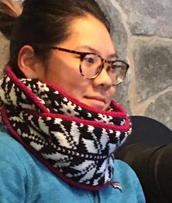 Each year after Christmas much of my family comes to Vermont to ski, sled and hike in the snow. This year we were blessed with lots of snow (and not so blessed with below zero temperatures....) so a snowy cowl was perfect for the weather. She was quite happy with the result. Me too! I chose two different snow motifs, a Scandinavian Traditional half flake and my own all over snow design. Together they make a blizzard of warmth...