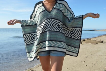 The Boho Beach Poncho was inspired by my Boho Throw Cardigan pattern and Baja stye beach blankets. Stranded color work combines with the linen stitch and stockinette to create a large rectangle with a patchwork look. Shoulder shaping rows are worked for a better fit when draped over your shoulders. Knit in one piece, there is no seaming making it a great beginner color work project! Knit up in The Fibre Co. Lore, a rustic wool yarn, this poncho is perfect for an evening walk on the beach or while enjoying a summer night bonfire with family and friends!