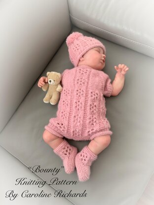 A pretty romper set knitting pattern which is knitted from the top down on straight needles. The instruction includes the booties and bobble hat. A versatile romper that can be worn with the buttons at the front or back.