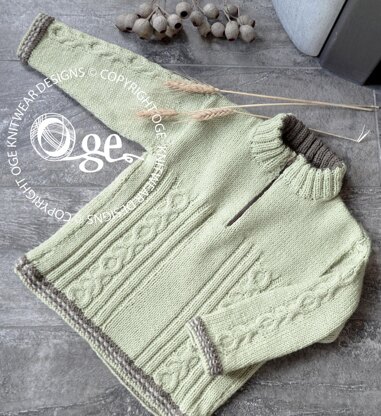 This cosy boy's jumper has a simple cable pattern on the front and sleeves, with a zipper opening at neckline.