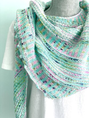 **Pattern Details and Suggested Materials** Boomerang/asymmetric triangle shape - like Albuquerque Sunset. 15" deep by 78" at neck edge Intermediate beginner and no brioche 2 skeins of fingering weight yarn - A and B don't really matter but this is what I did: **Color A (solid) - 400 yards Color B (variegated) - 400 yards** 10% wiggle room is built into my patterns for yardage so that is up to you if you are going to use less than 400 yards.