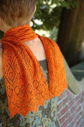 The scarf is knit in two pieces from outer edge to center and joined with Kitchener stitch.