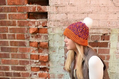 Shown slouchy, this hat can double as a beanie when the rib is flipped up. Its worked from brim to crown with Fair Isle stranded colorwork in the body that extends into the crown shaping. • The design features diamonds and triangles in a broken pattern. • Modeled in Child with the Eliot Zip-Up (sweater pattern sold separately).