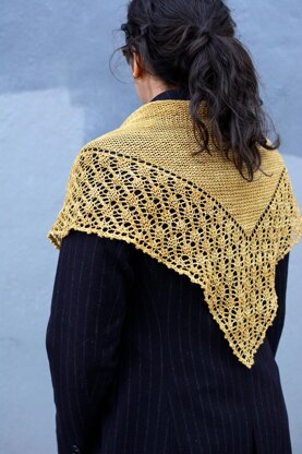 This simple triangular shawl is worked from the bottom point up. Broad bands of lace frame a garter stitch center, while picots are worked at the beginning of some rows. Both charts and written instructions are given.