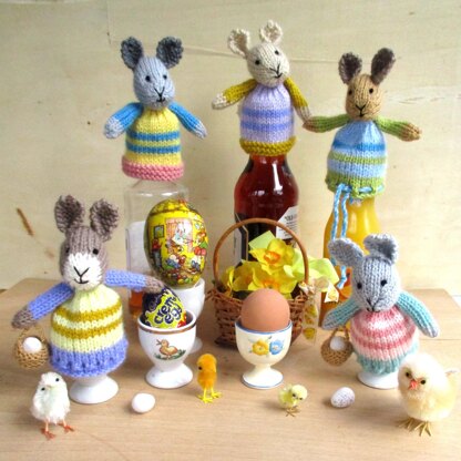 These cute bunnies are easy to make and will delight any child who finds one covering a chocolate egg in an egg cup or in a drawstring bag. Their tiny baskets will each hold a mini egg. The bunnies can also become cute bottle toppers. All make perfect Easter gifts and sell well at crafts fairs and bazaars. They will fit on standard egg cups and also on novelty ‘walking egg cups’ that can be found for sale online.