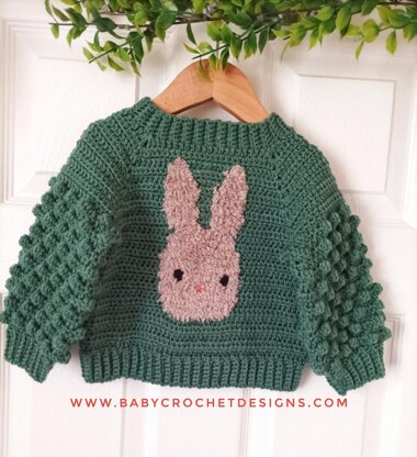 This jumper is worked in one piece starting from the ribbed collar, then working down, there's a video for changing the colours and charts for each size of the bunny, so that the bunny grows with each size instead of looking smaller. The join is at the back so it can also be made into a cardigan!