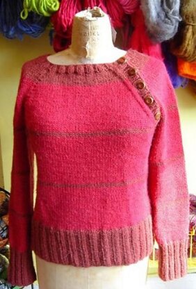 Button Me Up! is a fun, fast and easy pullover knit seamlessly in the round from the bottom up with raglan sleeves. The functional buttoned yoke is knit flat, with button bands picked up and finished afterwards. Just the thing to show off unique or vintage buttons - the ones on this sweater were pulled from a thrifted vest!