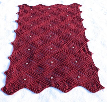 This richly textured rectangular shawl has it all: large diamonds, bobbles, lace and and an embroidered embellishment. All the techniques are easy and clearly described in the instructions.