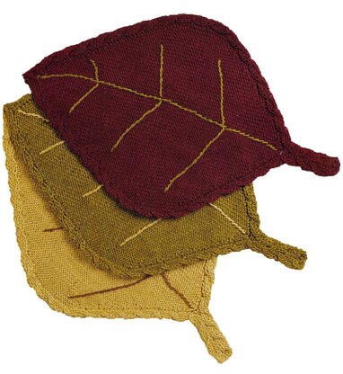 Knit in a leaf shape, accented with a cable border and embroidered in contrasting yarn. Can be made in one color or in a variety of colors. The pillow is two placemats sewn together and stuffed with Poly-Fil.