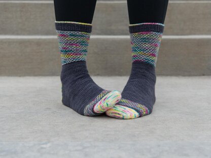 Brightly colored yarns are a sure way to satiate any knitter’s sweet tooth, though it can be a challenge to properly show them off. This design highlights the incredible hues of Spun Right Round ‘Blender’ by creating sprinkles of color across a dark background. The colors create tiny diamonds across the leg of the sock and are highlighted in the cuff, toe, and heel. Color, texture, and playfulness are at the heart of this design, perfect for the original Candyman himself… or his sweet-loving customers.