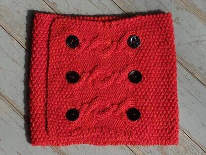 An easy introduction to cables this double breasted neck warmer, vaguely reminiscent of Victorian military uniforms, uses cables to cradle the buttons and to stand out against the seed stitch background. Easily adjustable to different sizing, this pattern has both written and charted instructions.