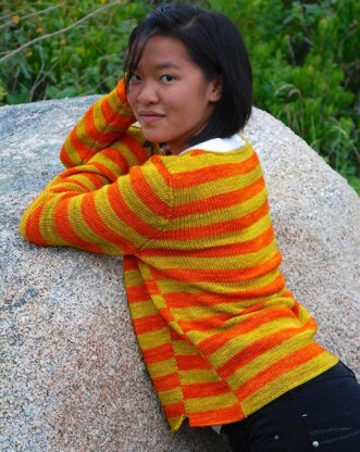 Opposing colored stripes form a v-shaped panel and vents in the front of the sweater add an interesting visual element to a relatively straightforward pullover. It’s knit in separate pieces, and the intarsia method is used when changing colors for the front striping. The shoulders are joined, the sleeves set in, and the neckband is finished.
