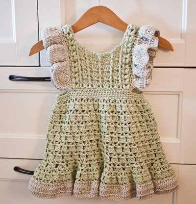 Carnation dress is made starting with the Front bib and the straps. Then you proceed with the waist and the skirt part. The ruffles are worked at the end. Color changes are optional, it will look great in one color two.