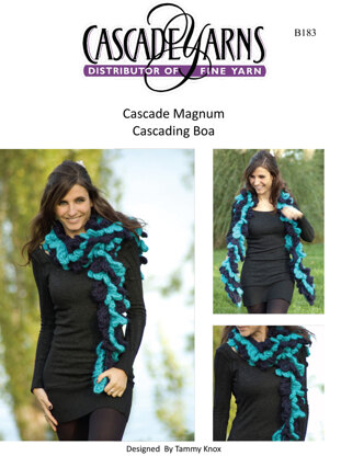 The Cascading Boa by Cascade Yarns is a fun, unique accessory to keep you warm this winter! Crocheted in contrasting colors of Magnum, a super bulky, super-soft yarn from Cascade, this scarf will fly off your hook.