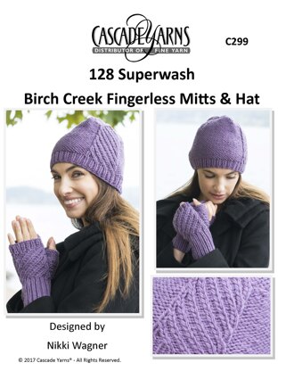 Cascade Yarns Birch Creek Fingerless Mitts and Hat designed by Nikki Wagner is a gorgeous matching set knit in reverse stockinette and Birch Creek Left and Right-Cross pattern that is both interesting and easy to do. Knit in Cascade Yarns 128 Superwash 100% superwash chunky wool yarn is perfect for projects that you want to finish quickly, but also want to be easy care.