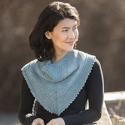 an asymmetrical triangular shawl wrapped around the neck. The accessory is knit