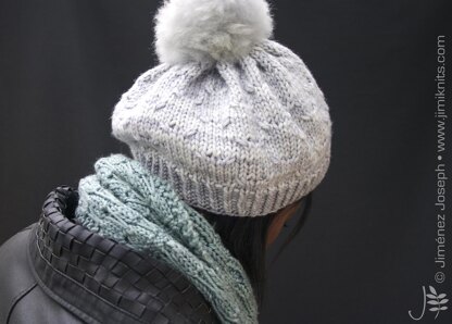 Céri Beret is a loose-fitting, chunky beret is made from the bottom up with a stretchy twisted rib brim and textured Cherry Leaf patterning. It is finished with a fur pompom. Alternatively, with additional yarn you can create a pompom of similar size. A quick project that would make a perfect last-minute gift.