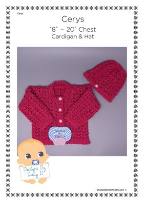 Cerys is a Baby Knitting Pattern for a cardigan and a beanie-style hat. It will fit a baby18''-20"chest using DK yarn and 4mm needles. 200g of DK yarn and 5 buttons are required.
