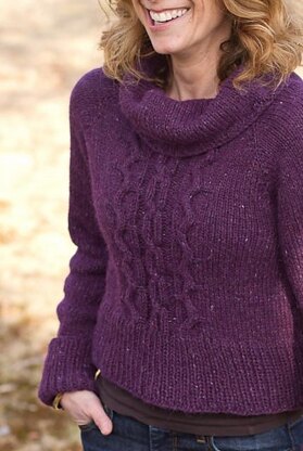 The unusual cable is not only a pretty design element, but it brings the eye to the center of the body - and the cozy cowl neck is perfect for a late winter day, while drawing the attention up towards your face. A deep ribbing hits higher on the waist and doesn't hug the body. A tee shirt or fun belt can poke out down below, and long cuffs also add to the cozy feeling while bringing the eye again, out to the side.