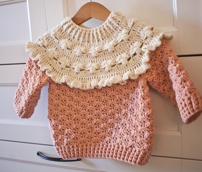 Charlotte Sweater is worked top down with a very textured yoke. It’s completely seamless. The ruffle is added later and can be also skipped. The sweater can be worked in one color too. It works up very quickly.