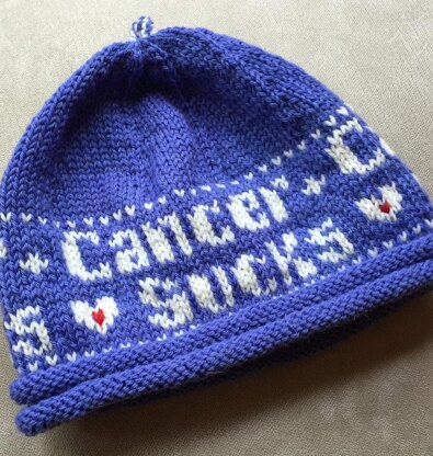 Cancer sucks. And many of the medications used to treat it are godsends that can also bring some very unwelcome side effects. My neighbor has lived with breast cancer for many years and of all the problems she has endured, the one that bothers her most is the loss of her hair. Hair defines us in so many important ways. Somedays a cap that is beautiful might do the trick. Other days, well, this cap might be just what the wearer needs. This cap has a rolled brim that can be knit two ways, a single roll (simplest) or a double roll (cooler), which gives it a hefty brim to surround the face.