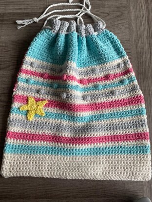 Child's drawstring crochet bag great for the beach or days out, it will fit all the necessary bits and bobs and a few more besides. Can be made in one colour to make a perfect school pump bag or sports kit bag. Made in cotton so heavy duty and easy to wash through.