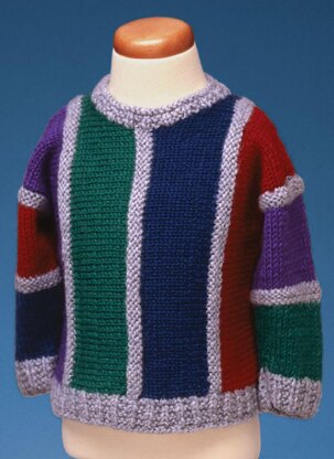 This easy sweater is worked from side-to-side – no intarsia needed for the stripes! There is an optional back neck slit, which comes in handy for smaller sizes. And the pattern goes up to size 20 to accommodate plus sizes and older kids! Work the coordinating adult’s pattern (#147) to match.