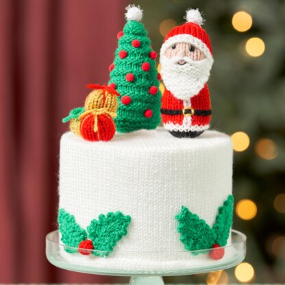 Knit up this Christmas Cake topped with a display of Santa’s living room, and use some glittery yarns too for a festive sparkly touch. Each of the top decorations are stuffed toys, so you can use these to make a diorama display without the cake base, hang them on your tree, or use them to top an edible cake. My cake covers a polystyrene cake dummy so it has a smooth and flat surface to decorate. If you cannot find a cake dummy you could cut cardboard or plastic mesh pieces the same size as the cake, place these inside the walls of the cake, and stuff with filling instead. Designed by Amanda Berry @fluffandfuzz, this cake is knitted in acrylic DK yarns. The cake cover is knit in the round using DPNs or a circular needle for Magic Loop. The decorations are worked flat on single pointed needles (not in the round). The icing and fire surround are i-cord tubes which can be worked on two DPNs or a circular needle. For confident beginners/intermediate and above.