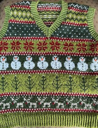 This fun festive design is knitted in DK wool. The pattern gives instructions for ages 1 to 12 years and the written instructions include charts. You will require 150 to 200 g of the main colour and less than 50g of three further colours.
