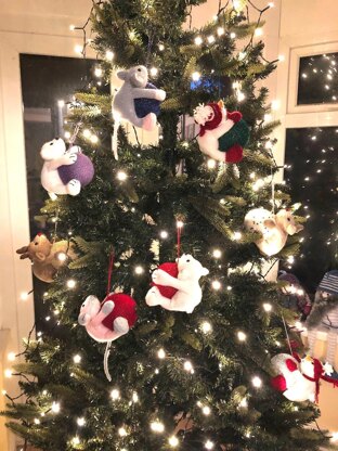 This pattern includes the directions for the bauble cover and 4 characters, Polar Bear, Snowman, Sugar Mouse and Reindeer. You will need 8cm polystyrene baubles, double knit yarns, 3mm straight needles for the bauble cover and 2.5mm straight knitting needles for the characters, 8mm toy safety eyes, and toy safety stuffing.