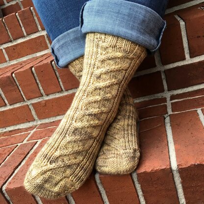 These socks are knit from the toe up and use an afterthought heel. To keep them comfy and easy to wear the foot has a ‘princess sole’ and the back of the leg is simple, squishy ribbing. The cable panel snakes it’s way from the toe to the cuff.