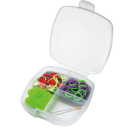 The Knitting Accessory Set for Socks from Clover includes useful, basic accessories you'll need for sock knitting. In the set you'll find 10 Quick Locking Stitch Markers in size small, 20 Soft Stitch Ring Markers in size small, 2 Double Pointed Needle Protectors (in a cute sheep shape!) for needle sizes US 0–5, and 2 Darning Needles in sizes 20 and 21. It all comes in a convenient plastic case so nothing gets lost!