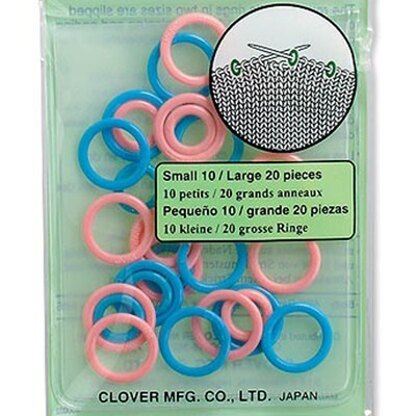 Clover Stitch Marker Rings includes 10 Small, 20 Large markers in both pink and blue. Markers are made from firm plastic in closed circles that will not fall out of your project or snag your stitches. These markers will accommodate up to a US 15 (10mm) needle.