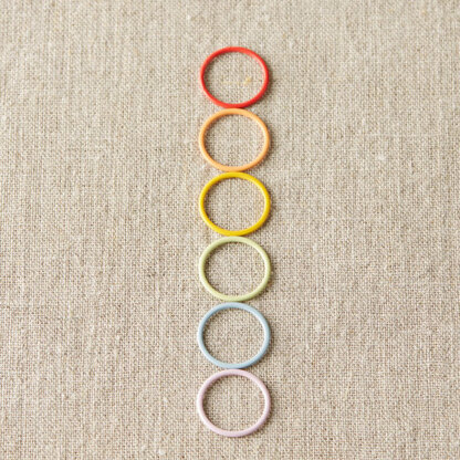 Cocoknits Jumbo Stitch Markers are a great way to keep track of stitch repeats, the end of the round, or pattern shaping on your bulky weight knitting projects. Fitting sizes up to US 19 (16.00mm), these nylon coated steel rings come in a muted rainbow of six colors. Set includes 30 markers, 5 of each color.