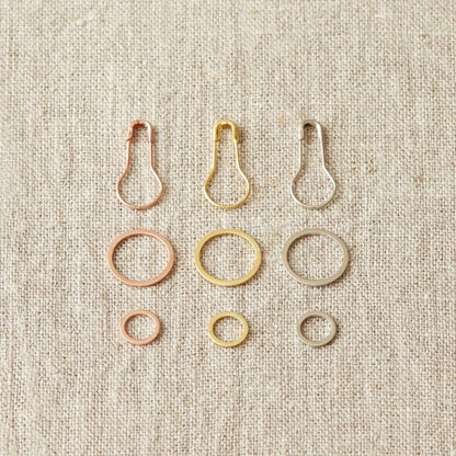 Cocoknits Precious Metal Stitch Markers are fun stitch markers finished with gold, silver, and copper coloring. There are 54 markers total in a charming kraft box which fastens with a click of a magnet. Included are 18 large round stitch markers (six of each color) that can accommodate up to US 15 needles, 18 small round stitch markers that can accommodate up to US 9 needles, and 18 opening stitch markers that can accommodate up to US 11 needles.