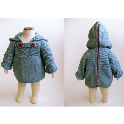The sweater is knitted sideways from left cuff to right cuff, casting on and binding off for the front and back. The hood is knitted separately and sewn on.