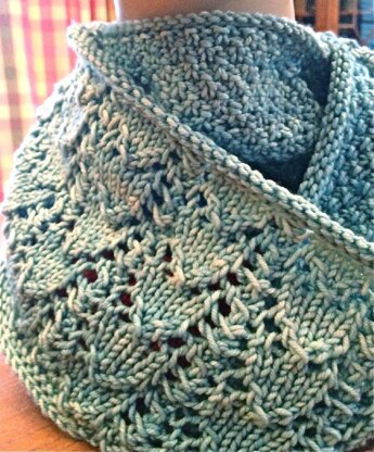 Copley Square, Boston is one of my favorite places on earth. To me it is the heart of Boston. And one of the windiest places I’ve ever walked through in winter. This is my favorite cowl ever, a cowl that is pretty and lacy, but warm too. About one third of the cowl is my favorite lace, Snowdrop, the rest of the cowl is Moss Stitch. Both are lovely but simple stitches. A cowl that is all lace won’t keep my neck warm. A cowl that is just solid isn’t quite pretty enough. The lace shows in the front of the cowl giving an elegant facade, while the moss stitch gives warmth and looks nice from both sides. This cowl is the best of both worlds, pretty and practical and easy to knit.