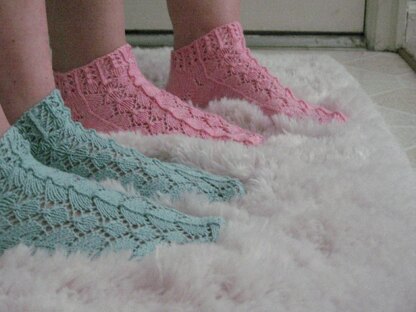 Coralee Ankle Socks are knit from the toe up with a short-row heel on superfine weight yarn for a gauge of 32 sts and 44 rnds to 4"/10 cm. The pattern includes 4 sizes from XS to L and takes approximately 150 to 300 yards to knit. The lace pattern, which begins on the toe and continues up to the complimentary lace rib cuff, emanates from a central line on the instep caused by a series of increases and decreases. A feminine, lightweight anklet for girls and women!