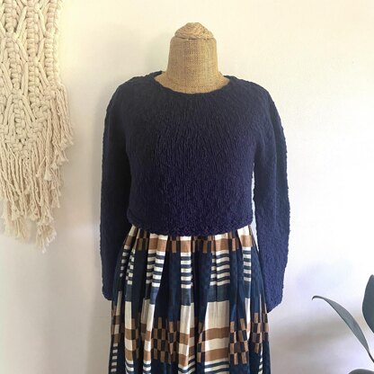 The Cotton Crop is an easy to knit and wear pullover that is beautiful in its simplicity. This cropped sweater knits up satisfyingly quickly in a heavy worsted weight yarn. The seamless design and majority of the sweater being worked in stockinette stitch makes for a great beginner level garment. A bit of garter stitch on the neckline, hem and sleeve cuffs, and the slightly thick-and-thin texture of the yarn, makes for a classic yet interesting design. The Cotton Crop is a great layering sweater for those times when you want to look stylish but don’t want to overheat in wool or other animal fibers!