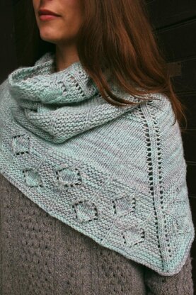 The lofty single ply knits up like a dream. A combination of stockinette and garter sections are simple enough to show off the subtle colors, but little lace diamonds accent the edges of the piece and keep the knitting fun. It's a quick, fun project, and perfect for a beginner shawl knitter.