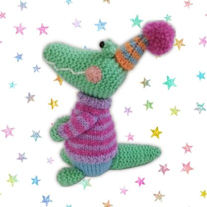 Get your party shoes on and prepare to dance the party season away and “Croc around the Christmas Tree” with this Crimbo Crocodile. Croc is ready for the season’s festivities with their sparkly sweater and party hat. The green crocodile pieces are worked in garter stitch, and the other pieces are worked mostly in stockinette. Note the sweater is “mock” and knit as a separate piece to give the illusion of a layer of clothing.