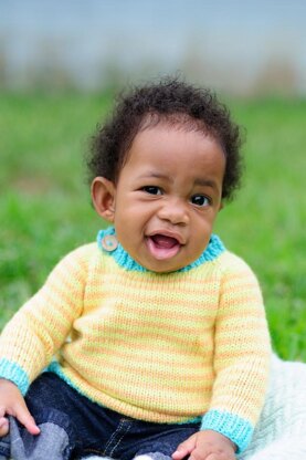This cutie pie basic raglan features an easy stripe pattern with contrasting ribbed hems. It's worked from the top down, so length can be added easily, to make for more growing room. It also features a buttoned neckline for a roomy fit over baby's head. This pattern is a great first sweater project. Sweet baby Cruz is wearing size 6 months.